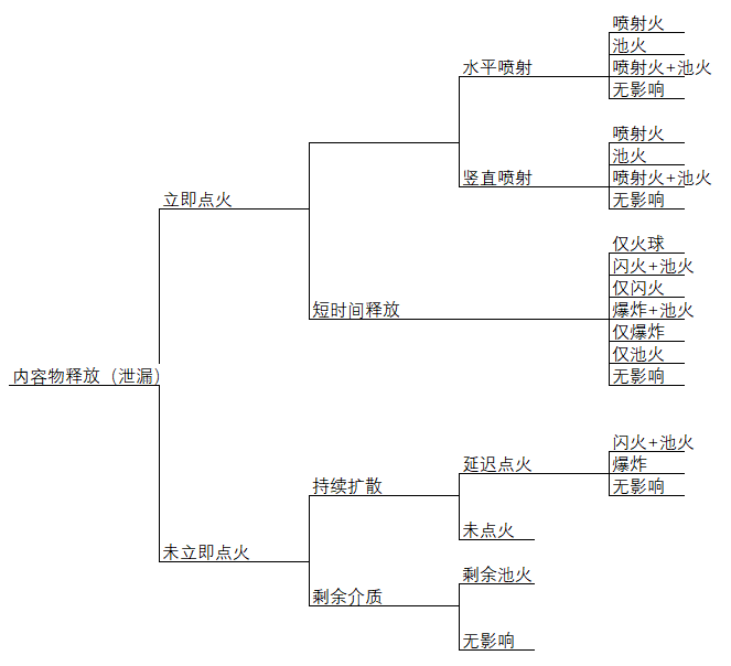 (3)场景事件树构建:对各分析单元可能发生的如泄漏、BLEVE等场景进行事件树的构建,注意结合现有安全措施(如:水喷淋、可燃气体探测、连锁切断等措施)。