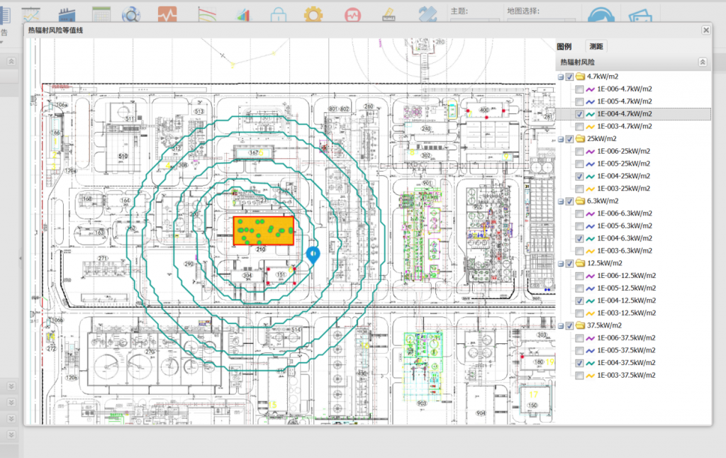 火灾热辐射分析实际上是QRA分析中的一部分,所以和一般的风险分析一样,分析结果需要呈现出后果等值线(即 6.3 kw/m2、12.5 kw/m2、10/20/40kw/m2、35kw/m2)以及与其对应的累积频率,在RiskCloud QRA软件中通常以热辐射频率等值线形式呈现。(火灾热辐射的风险累计频率取值可参考爆炸的频率,按照1×10-4/年取值)。