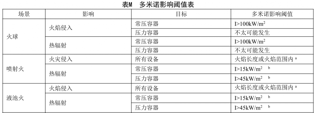 也可引用其他权威资料或标准中的多米诺阈值,如江苏省地标:DB32∕T 4745-2024《化工装置事故多米诺效应风险评估导则》D.2.1多米诺事故扩展判定准则章节中表 D.22物理破坏效应阈值计算表中也有不同类型设备的多米诺阈值。