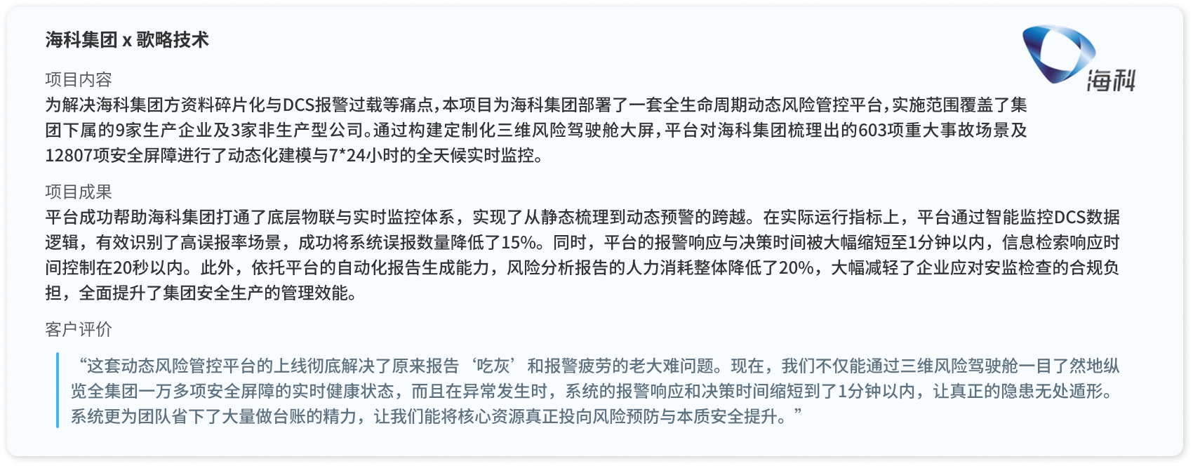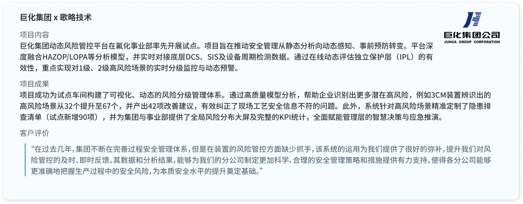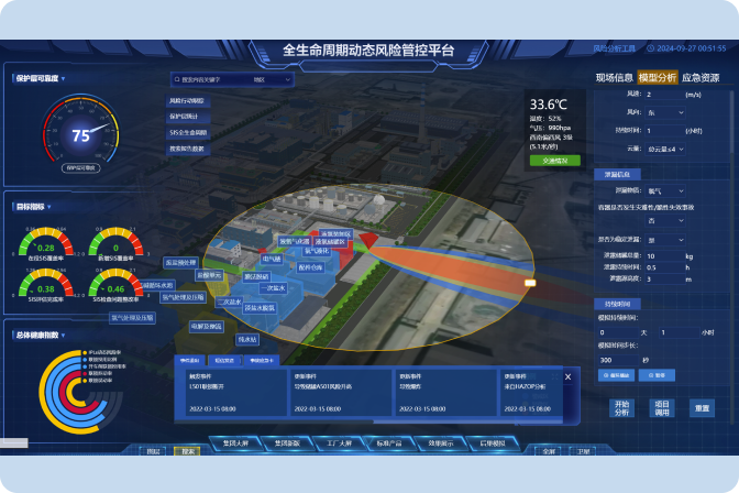 歌略技术的动态风险管理解决方案以RiskCloud全生命周期风险分析工具为底座,深度融合了在线量化评估与IoT技术,实现从底层设备仿真、安全防护屏障维护到公司/集团大屏的动态风险可视化管控。辅以资深专家团队的专业技术服务,全面赋能企业安全生产、智慧决策与应急响应。
