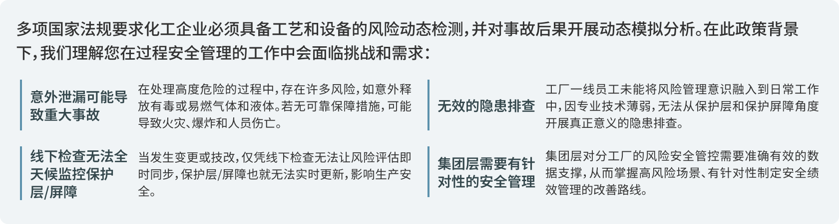 实时数据驱动静态全周期风险分析为动态风险管理,助力企业实现风险可见、趋势可测、隐患可控,全面提升本质安全水平。